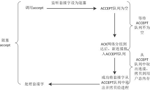 这幅图中可以看到,阻塞套接字上使用accept,第一个阶段是等待ACCEPT队列不为空的阶段,它耗时不定,由客户端是否向自己发起了TCP请求而定,可能会耗时很长。