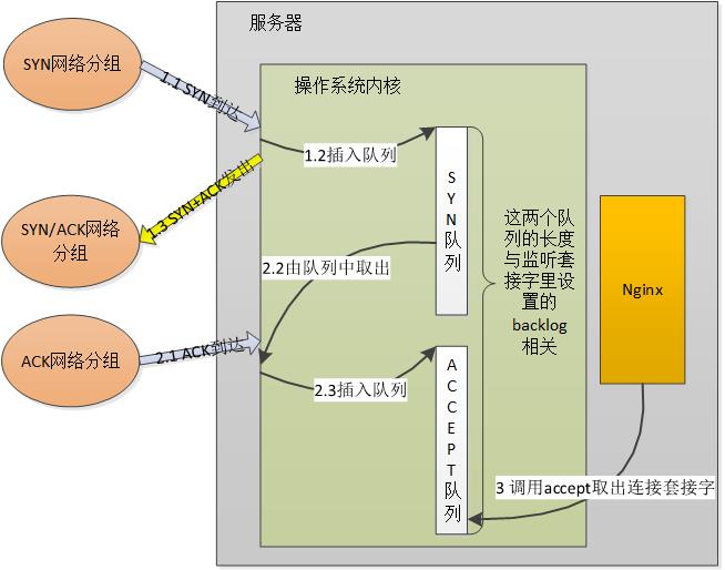 原因在于:首先,SYN队列和ACCEPT队列都不是无限长度的,它们的长度限制与调用listen监听某个地址端口时传递的backlog参数有关。既然队列长度是一个值,那么,队列会满吗?当然会,如果上图中第1步执行的速度大于第2步执行的速度,SYN队列就会不断增大直到队列满;如果第2步执行的速度远大于第3步执行的速度,ACCEPT队列同样会达到上限。第1、2步不是应用程序可控的,但第3步却是应用程序的行为,假设进程中调用accept获取新连接的代码段长期得不到执行,例如获取不到锁、IO阻塞等。
