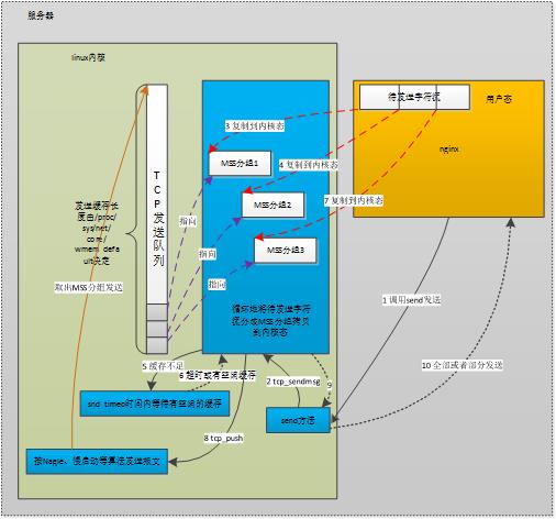 (7)将剩下的用户态数据都组成MSS报文拷贝到内核态的sk_buff中。