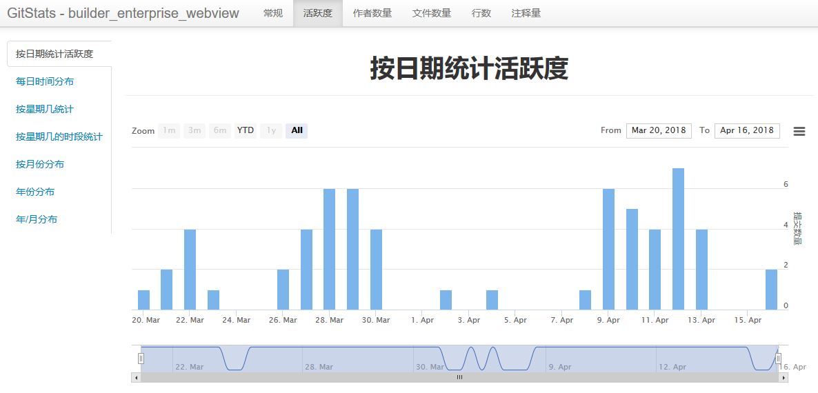 4、搭建nginx用以展示页面。实际上仅需要在配置好的location内加个alias指向上一步中-o选项生成的目录即可。 可见,该工具生成的页面有助于我们统计代码库中总体的代码提交趋势,以及每个coder的代码提交趋势,对于技术管理是有意义的。以下是我截取的最好用的两个页面,首先是按日期统计活跃度: