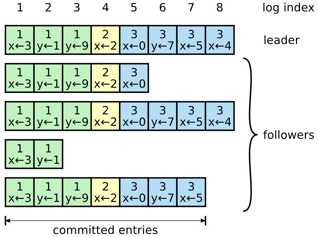 leader需要把写日志同步到大多数follower后才能更新状态数据库,并向client回复写成功。如果没有得到多数follower的成功应答,leader会重复发送这条日志更新请求。下图中有8条日志3个任期5个节点,每条日志里除记录了操作行为外还记录了当时的任期:
