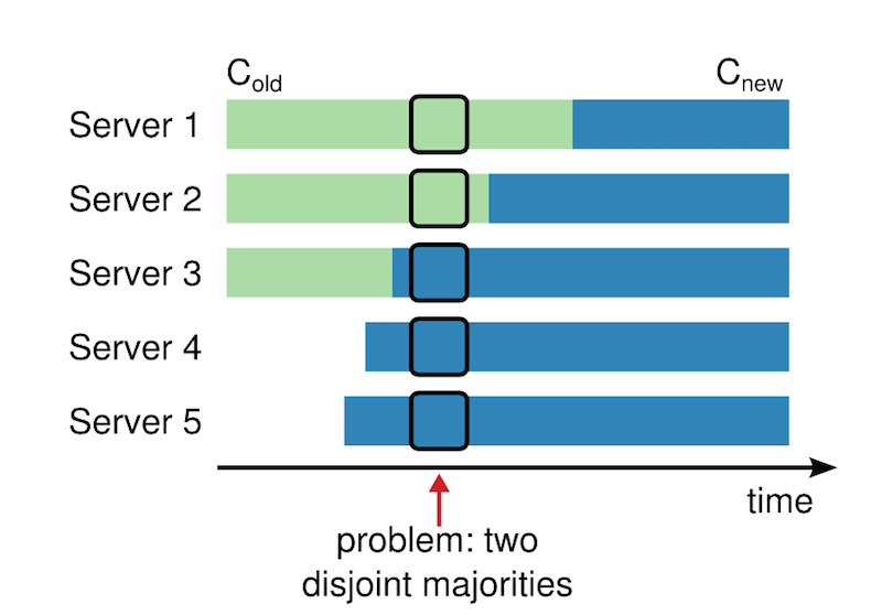 通常我们把raft集群配置为3或者5个节点,特别是5个节点时可以容忍2个节点宕机。这给我们平滑升级时带来了好处:1台台升级时仍然可以容忍1台宕机。但若我们的集群原来是3个节点的组合,却改为5个节点,如果这个过程是不停止服务动态完成的,这可能出现问题,如下图所示: