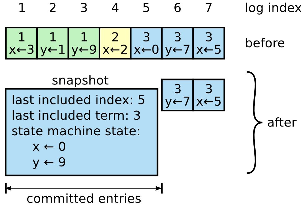 在上图中,原先的已经被提交的5条日志最终导致的状态是x=0&&y=9,故可以被快照替代,这便减少了日志量。