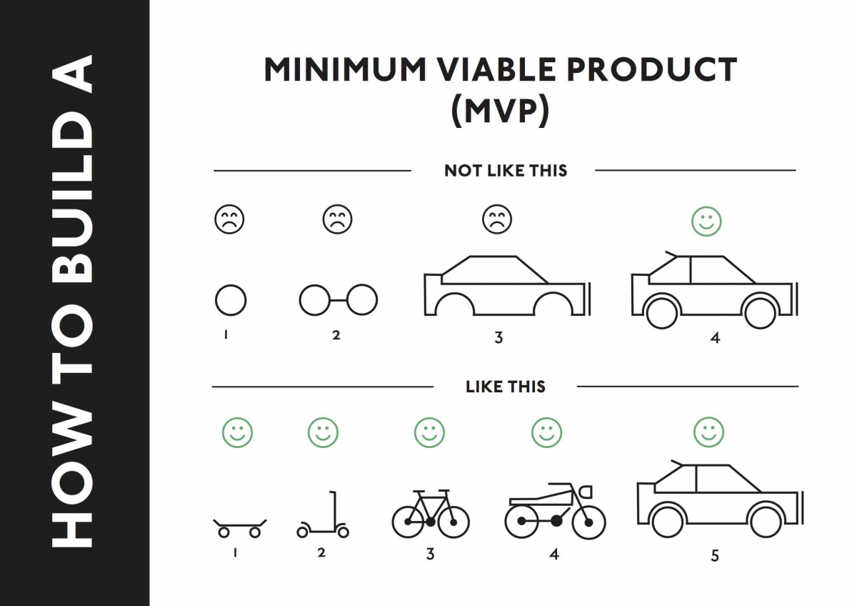 以滑板车、自行车、摩托车、汽车的方式迭代,这才是MVP,才能给用户提供微笑价值!