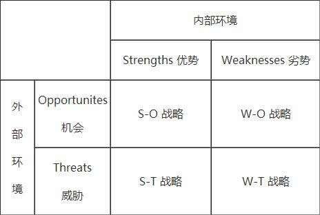 纵轴表示需求增长率,上方表示需求增长很快,这表示我们必须花更多的资源才能满足用户。所以,左上角就是明星产品,它值得花大力气去研发,而下方的金牛则是可以考虑变现,潜力不足但市场占有率很高。对于右上角市场占有率低且需求增长很快,则明显是个“鸡肋”,这种问题产品应该尽快放弃掉。 能像以上这样思考问题,就有了行业视角、老板视角,这样的大局观是高级产品经理必须具备的。或者使用下面的SWOT态势分析法,从战略层面上定位自己的产品。