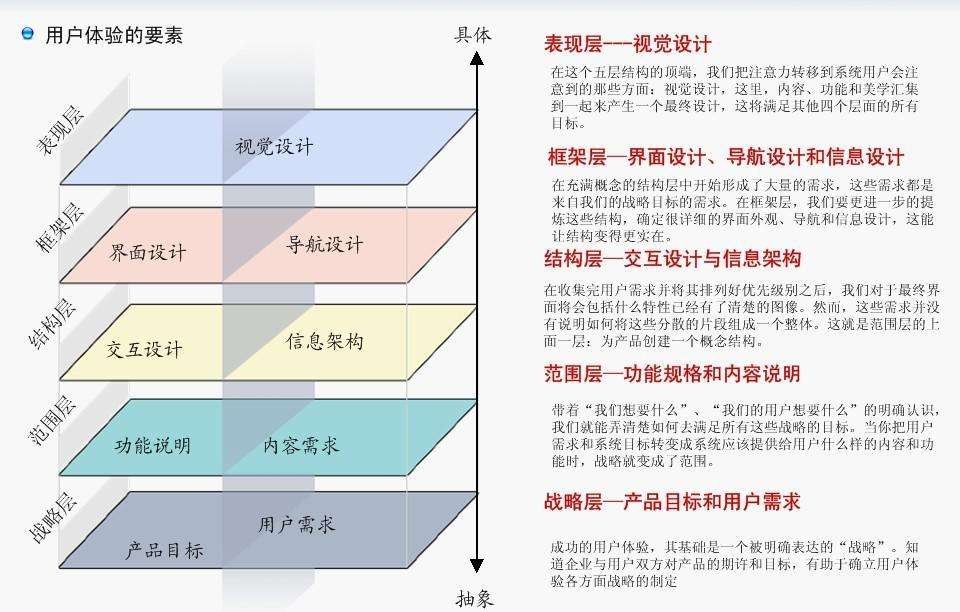 这要求我们必须具备从用户体验出发的设计思维,就像下面这张图,从用户体验的5个层面上思考产品的设计: