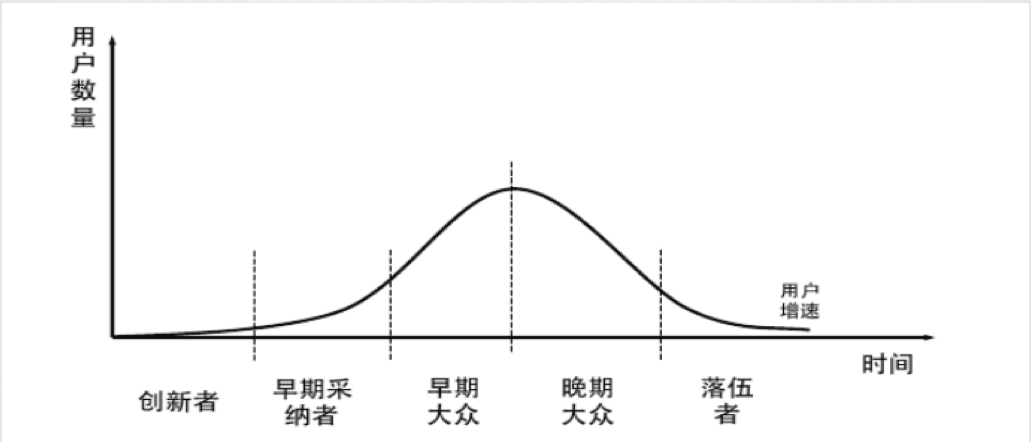 产品经理需要有运营视角,因为需要从迭代中要数据,从数据中去迭代。在产品的不同发展周期,用户群体也是不同的,如下图所示。