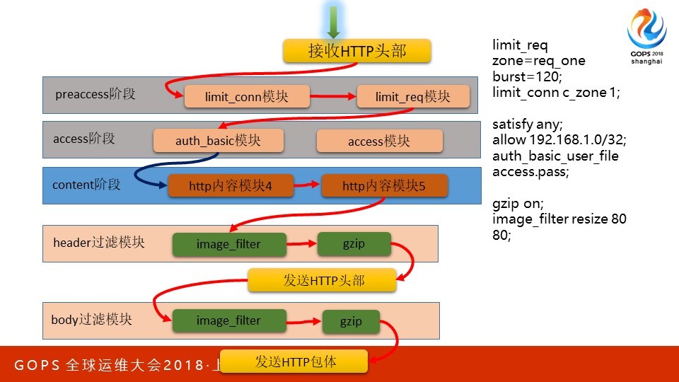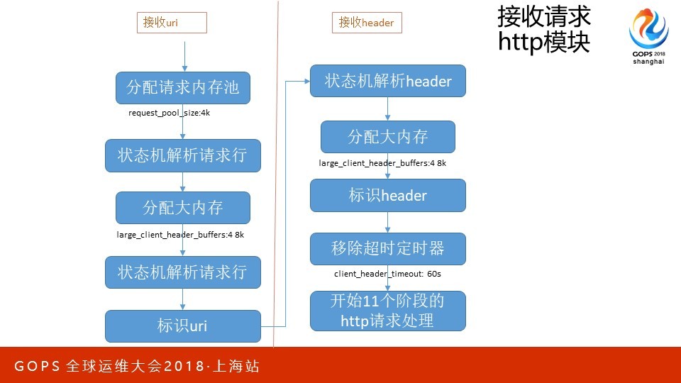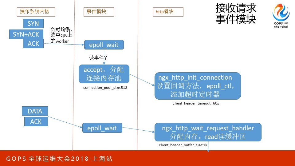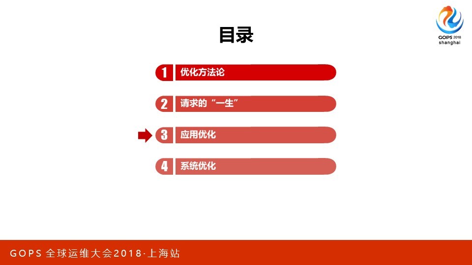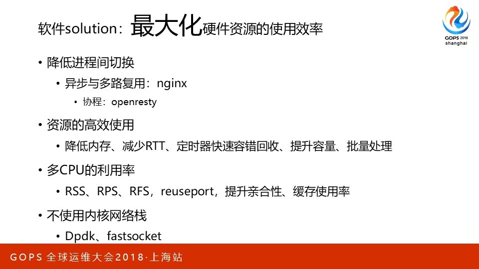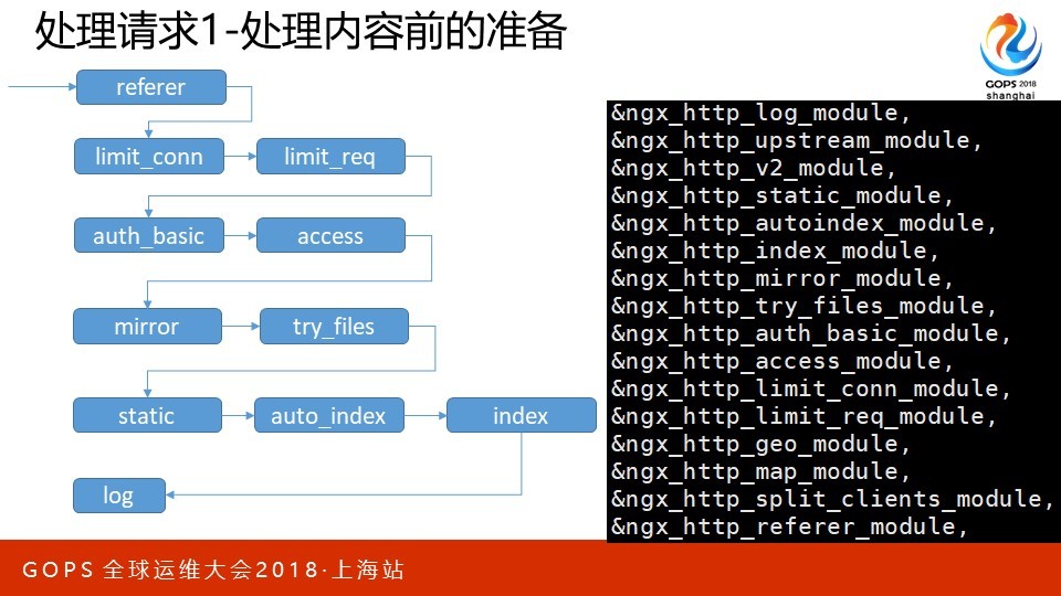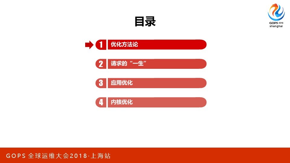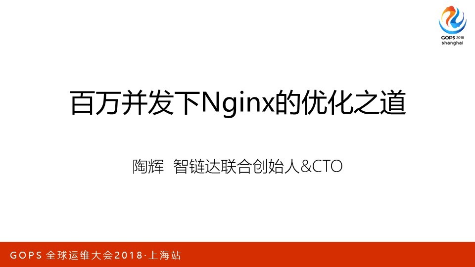 本次会议地点在上海光大会展中心,我在大会场超级五分钟里演讲的内容只是PPT的前5页。这次我想分享的是C10M问题在Nginx上的应用。优化从来都是一个持续过程,所以最需要的是方法论。我会从硬件、集群到单机软件的优化作一个系统的阐述,希望可以把我的心得有效的传达给大家。 PPT我分为四个部分,分别是方法论概述、一个请求在Nginx中是如何被处理的、应用层优化、系统层优化。其中第二部分我更希望用一种感性的方式,为后面的内容作好铺垫。
