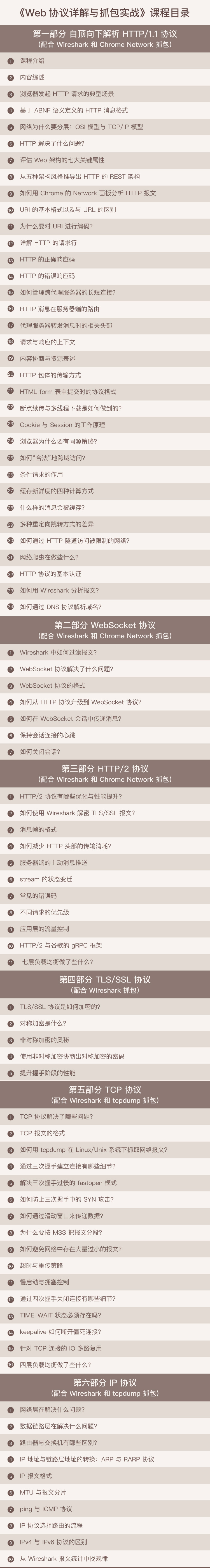 - 想要讲清楚,绝不是2、3个小时能做到的,至少要有10或者20个学时以上; 而与极客时间团队合作了《Nginx核心知识100讲》后,我的编辑张浩老师也跟我说,订阅了课程的同学反映非常好,也希望我能再出一门课,好好讲一下在Nginx课程里简单介绍过的Web协议。因此便萌生了制作《Web协议详解与抓包实践》这门课的想法。