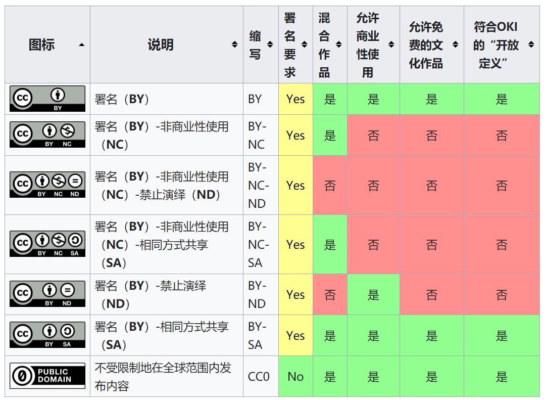 编辑主题_config.yml配置文件,在footer中找到creative_commons,这里可以设置知识共享许可协议。creative_commons中含有以下版权许可声明: