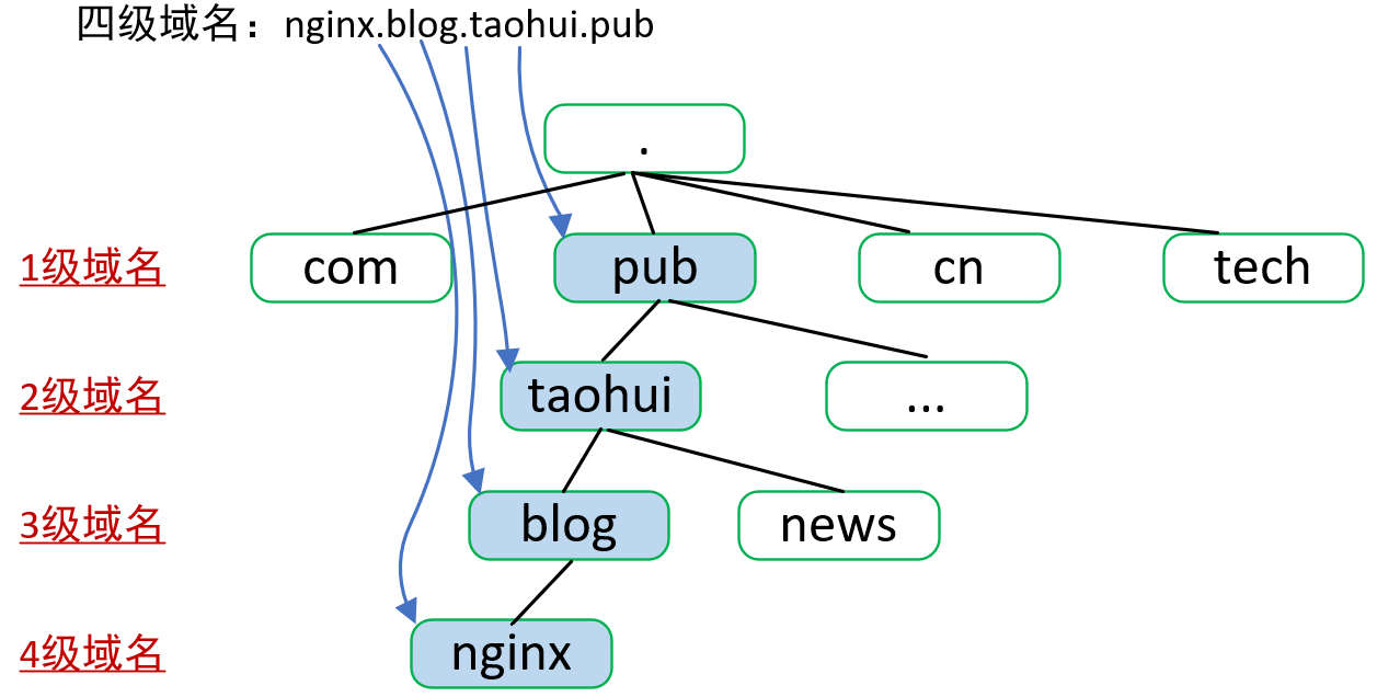如果你购买过域名肯定清楚,虽然只买到一个域名,但你会有无数个子域名可以使用。比如我买到的是taohui.pub二级域名(pub是一级域名),我就可以配置出blog.taohui.pub这个三级域名,甚至自己搭建一个子域名解析服务,再配置出四级域名nginx.blog.taohui.pub,甚至五级、六级域名都能使用,如下图所示: